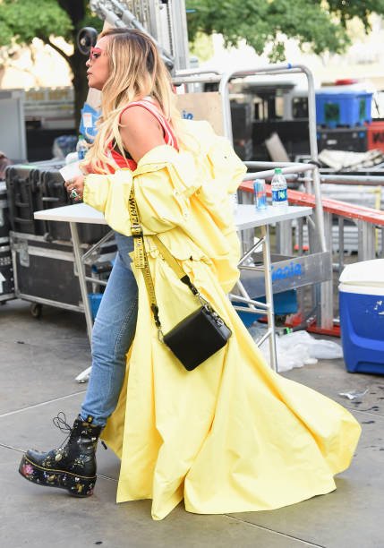 Sipping D’USSÉ VSOP cognac to help celebrate the launch of the company’s new 200ml bottle, Beyoncé, who was dressed casually in a red and white tee, a tan, patterned Gucci jacket and matching cap and Daisy Dukes, and Jay-Z watched hip-hop star Cardi B perform onstage as it rained. She also hung out backstage with Bey.